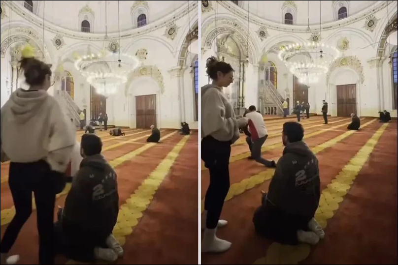 Görüntülerde bir genç kızın cami içerisine uygunsuz şekilde girdiği ve rahatsız edici hareketler sergilediği görüldü.