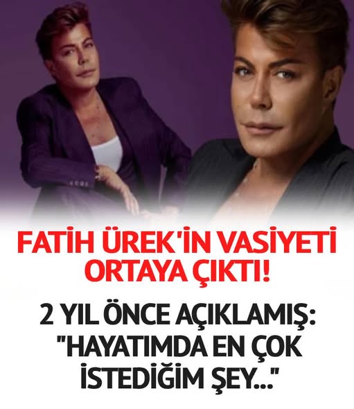 FATİH ÜREK'İN VASİYETİ ORTAYA ÇIKTI Vefat eden Fatih Ürek'in çok merak edilen vasiyeti ortaya çıktı. 2 yıl önce katıldığı programda samimi açıklamalarda bulunan Fatih Ürek; kendisine belgesel teklifi geldiğini belirterek vasiyetinin olduğunu söylemişti. Ünlü sanatçı 'Vasiyetini yazdın mı?' sorusuna; ''Aslında bir yerde yazdım bir yerlerde duruyor galiba ama her sene bir şey değişiyor. Kendi adıma bir vakıf istiyorum. Bir şey olsun bir hayır olsun. Hayatımda en çok istediğim şey benim adıma bir okul yaptırmak. Okul olsun istiyorum. Okullarımıza ihtiyacımız var. Ben çocukları görünce ağlıyorum. Yaşım geçti ondan mı acaba'' yanıtını vermişti.